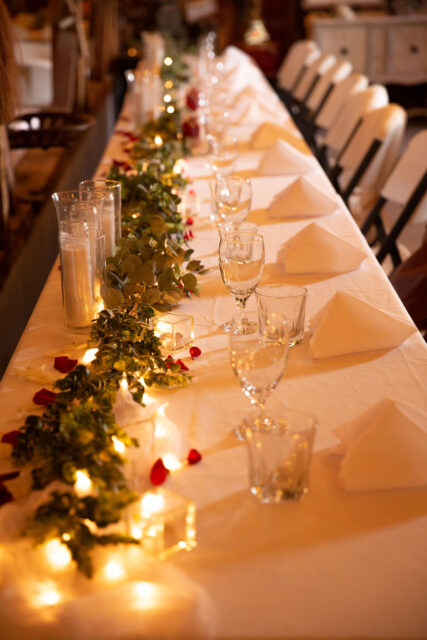 The venue was truly all in one. The ceremony was outside and then the reception was inside which decreased the amount of decor, driving, and stress for the wedding day. The venue we picked was already decorated with lights and pretty decor. This dramatically decreased the amount of decor that was required to make it look really elegant and beautiful. Decorating a completely empty building/room for a wedding can take a signficiant amount of decor to make it look good. This photo was the head table and the only thing we added to it was the wedding party glasses, candy, and the flower petals. They did everything else for us.