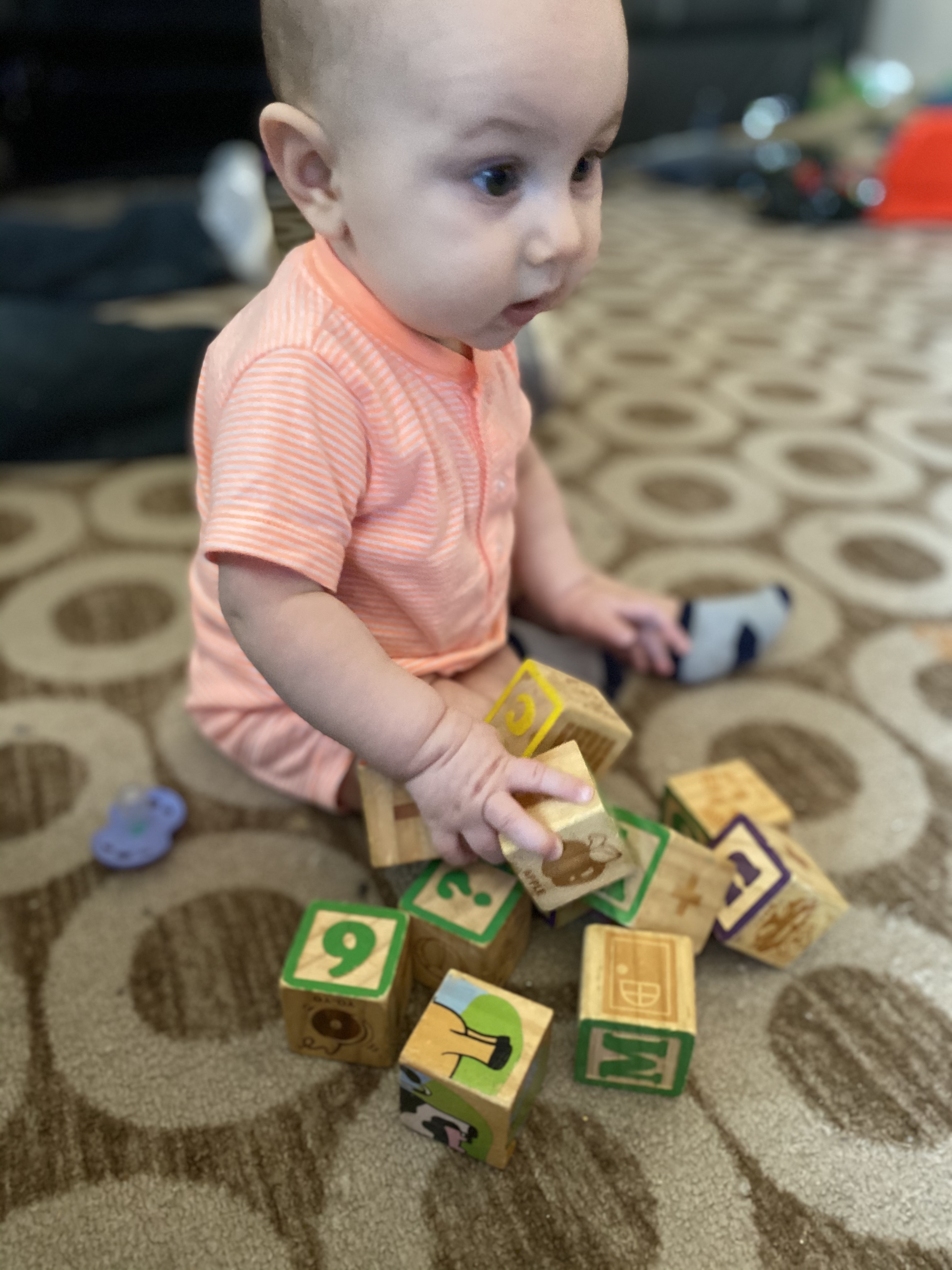Okay, this is actually a toy, but it does not make sounds. Carter has been loving these blocks for a while now. We love knocking down towers, throwing blocks into a container to make noise, and banging the blocks together. In the future, we will work on the alphabet and spelling with them, but for now, he is working on motor skills like picking things up and making towers.