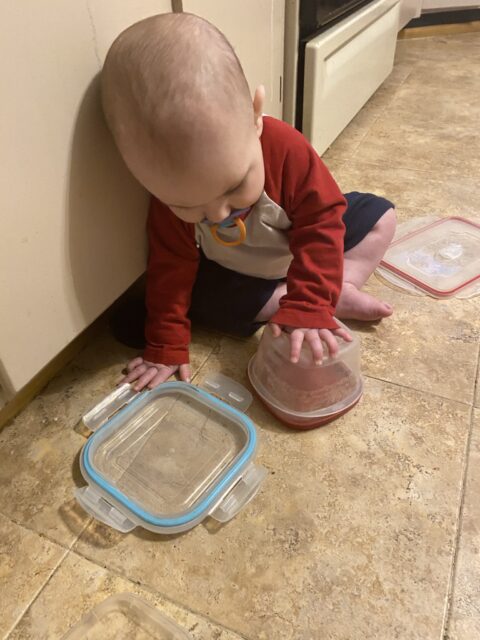 Obviously, Tupperware or plastic meal storage containers is at the top of the list. These ones are his favorite at grammy and grandpa’s because of all of the different sizes. He could spend 30 minutes just playing with these. The snapping lids are good for his motor skills and they are fun to throw around.
