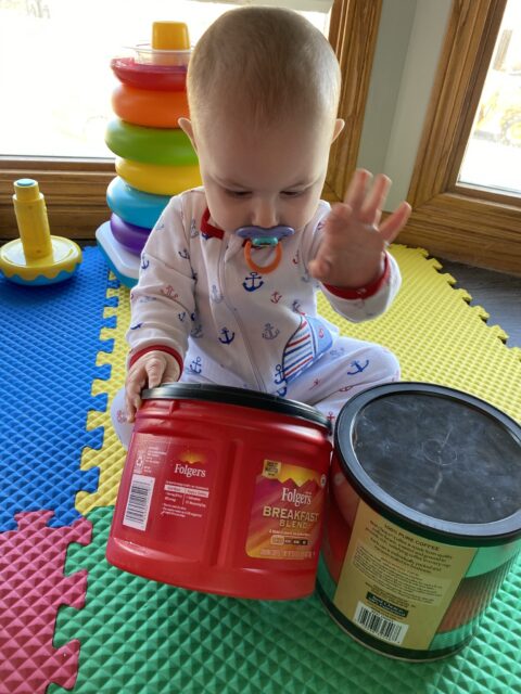 I first read about using metal coffee cans on another mom blog, but Carter has loved playing with his two coffee cans. He has one plastic one with the lid that has a block in it to shake and one metal one that he loves throwing the blocks into. They are fun for a rattle, drum on, or to roll. Now that he is standing, he loves standing on them to get on the couch.