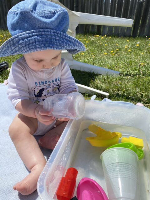When I stopped pumping and focused on exclusively breastfeeding, I found that we had a lot of bottles that were just hanging out in the cabinet and never getting used. Now he plays with 3 of the bottles from the cabinet. One is in that bathtub for water. One is in the pool, and one is in the car with beans and rice in it.