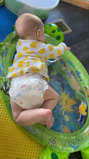 Sometimes he still likes playing with this, but he liked it a lot more before he could crawl and move around. It just fills with water and turns into a great no mess sensory pad.
