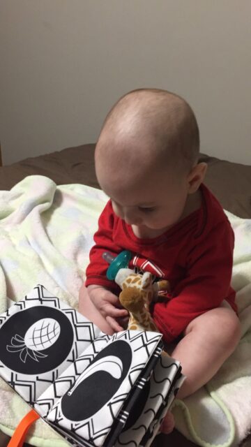 The soft fabric books have been an absolute favorite since he has been able to grab onto things when he was really little. We got black and white contrast ones when he was really little and they have a little squeaker in them too! At 1 year, he still likes holding them and playing with them. They are a great car toy because they are soft and easy to grab.