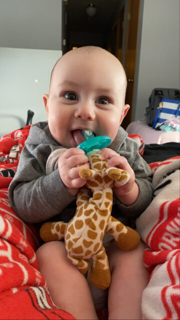 If you are a pacifier using parent, Carter has also loved his animal pacifiers. He has a giraffe and a little chick. He didn’t really use the pacifier on them a ton, but he loved playing with the giraffe and chewing on the pacifier part. I have soo many pictures from when he was little with his little giraffe. They are also great for in the car because they are easy to find if they are thrown out of the car seat or dropped somewhere. Now that he is a little older, we mostly keep his giraffe in the car!