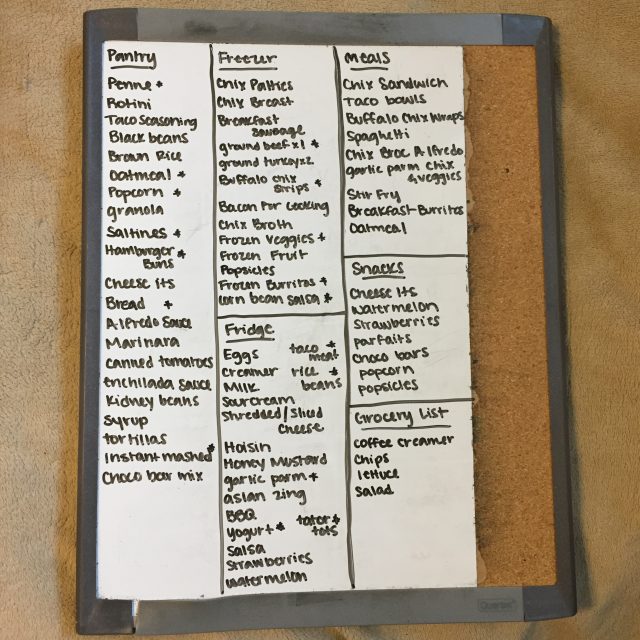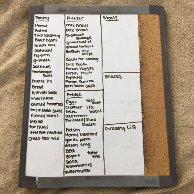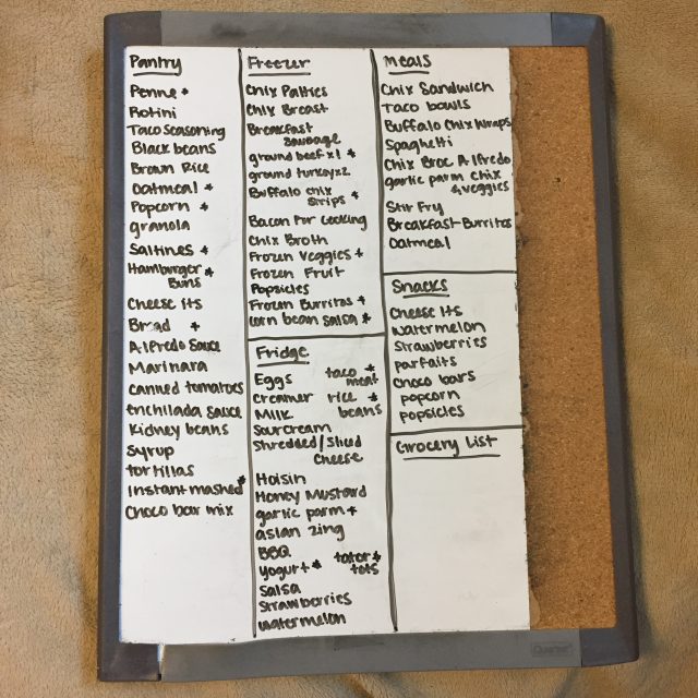 My very first step of meal planning is to go through my pantry, fridge, and freezer to make a complete list of EVERY single item. I use my marker board to make this list in a way that is very simple for me to use. When I list things out, I try to be pretty specific without taking up a ton of space. If you have cream corn, I recommend not just writing corn. It will be helpful when you aren’t standing in your kitchen. If you have multiple things of chicken in the freezer, I try to write a small quantity next to the item.